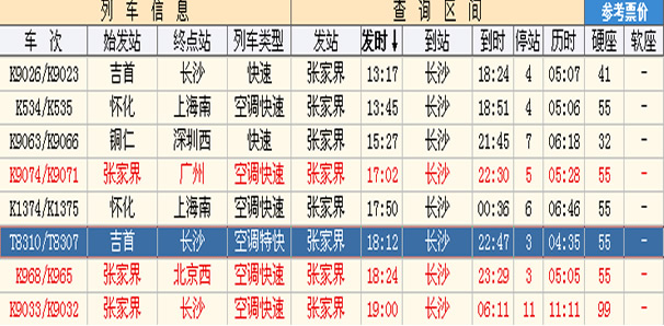 【始发站:长沙-----到站:张家界】 适合当日上午07:00前到达长沙火车附近的旅客。